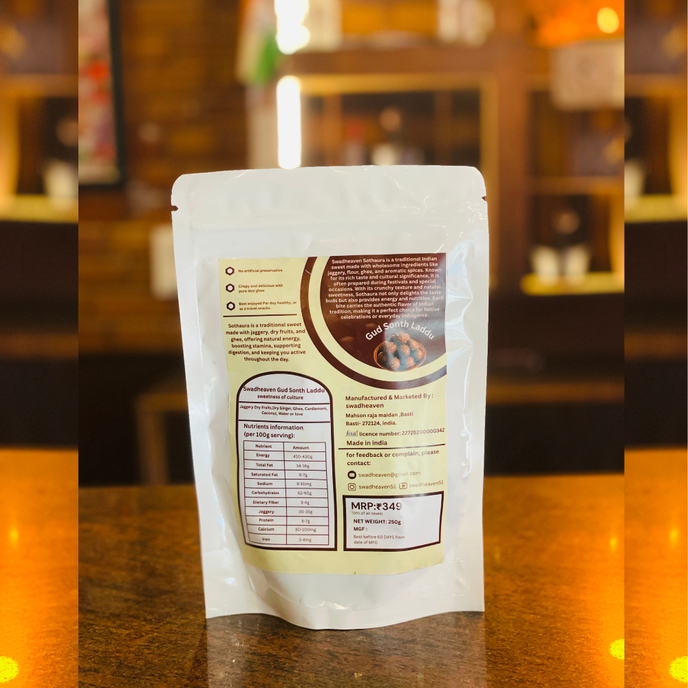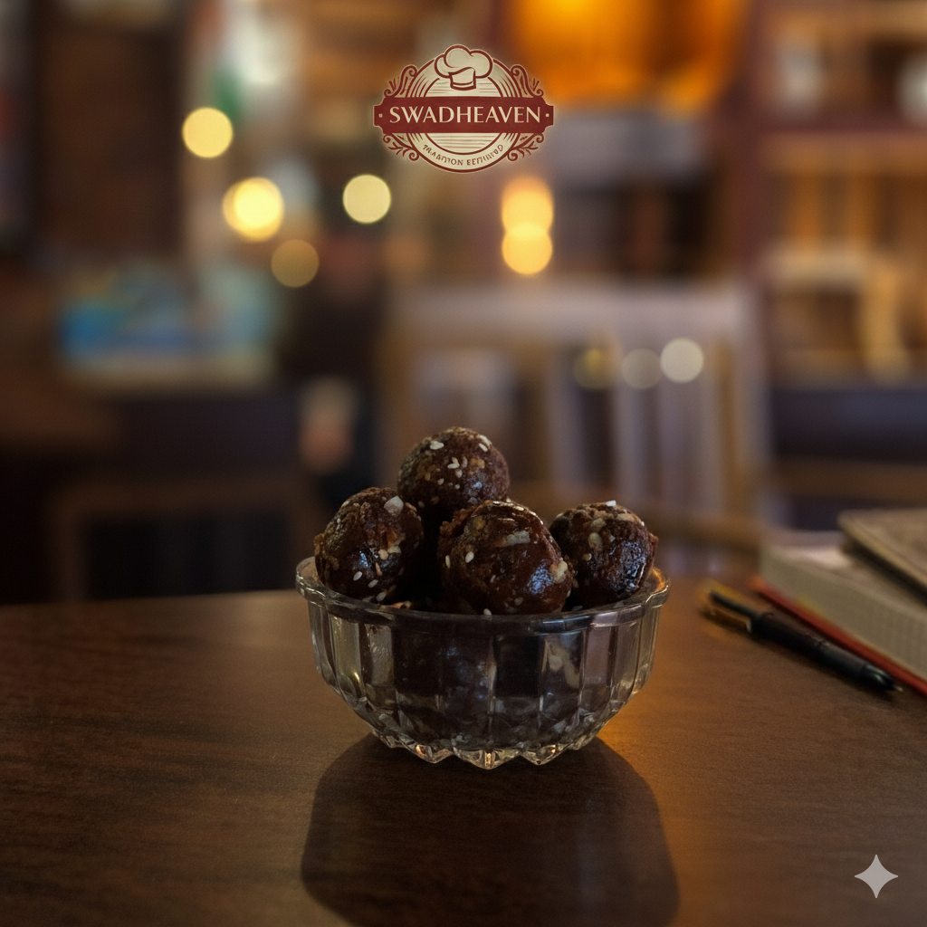 Swad Heaven Gud Laddu is a traditional healthy sweet made with jaggery, dry ginger powder (sonth), ghee, wheat flour, nuts, and spices. Known for its natural warming and immunity-boosting qualities, it is especially consumed in winters.